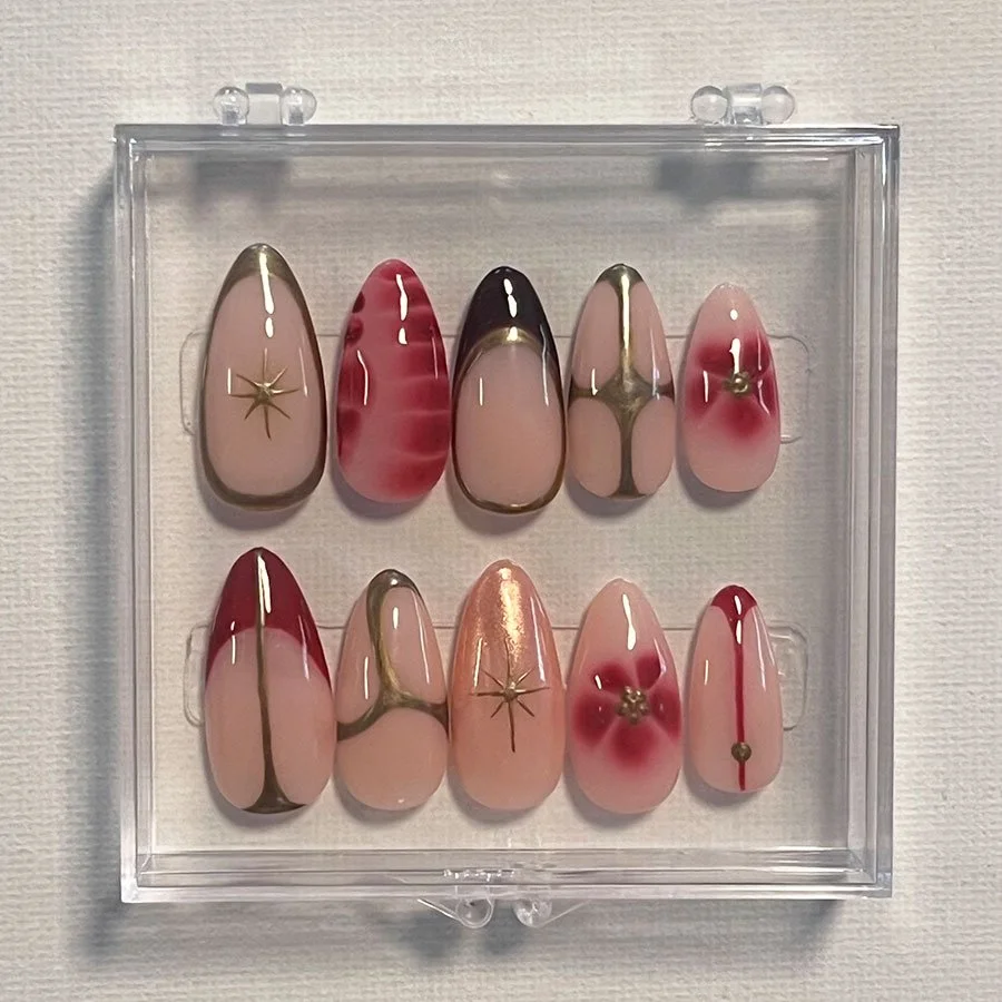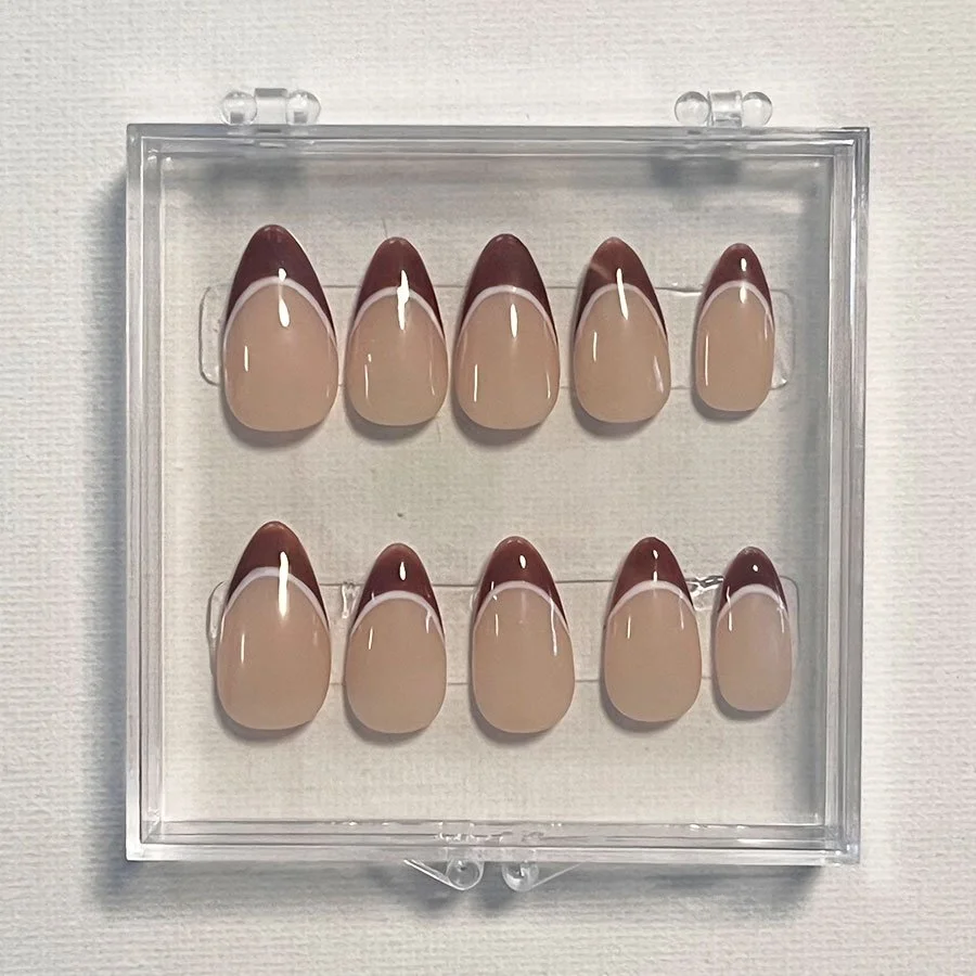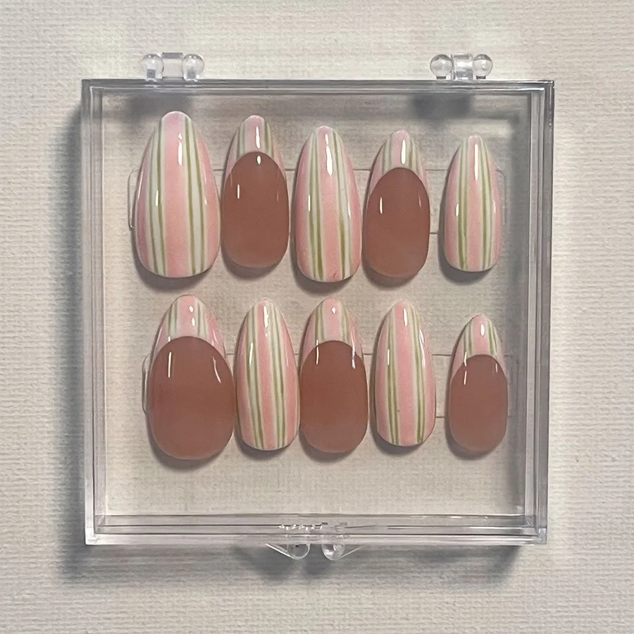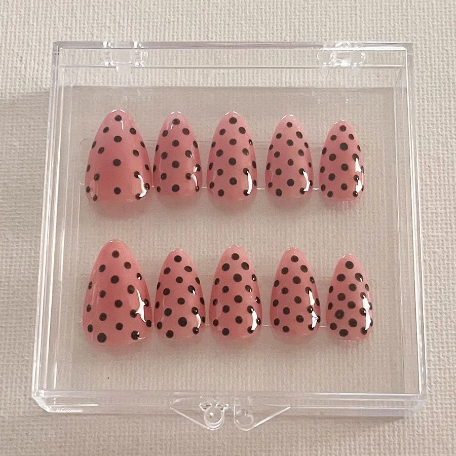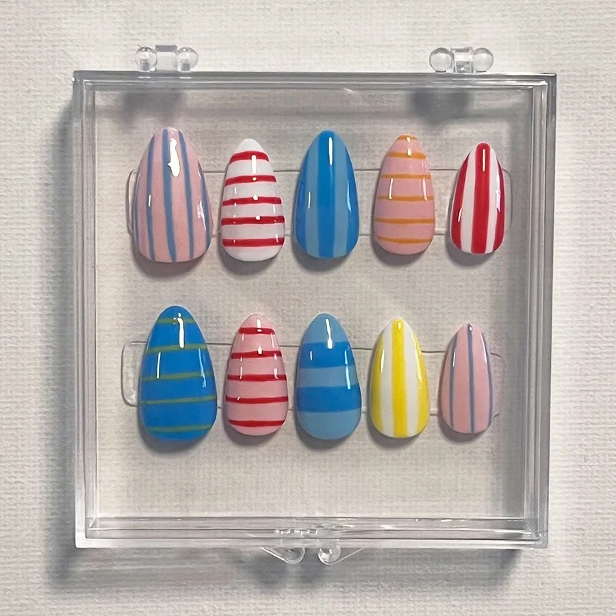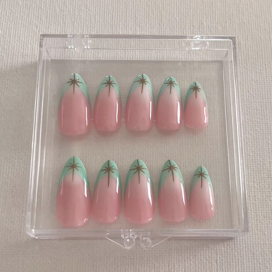 If you love any of the below sets but need a different size, just reach out for a custom size! Halloween nails $75.00 Colorful polka dots $65.00 Yellow French tip with stripes $65.00 Polka dots $65.00 White French tip $65.00 Tortoise shell wave with gold $65.00 Pumpkin nails $65.00 Dark purple nails $45.00 Light Green Nails $65.00 Green French Tip with Gold Stars $75.00 Blue with Gold Stars $65.00 White French Tip with Gold $65.00 Green Chrome $45.00 Pink Bubbles $75.00 Leopard French Tip $65.00 Blueberries $65.00 Red with Leopard $65.00 Pink & Orange Fade with Gold Stars $75.00 Red & Gold $75.00 Dark Green $45.00 Brown & Gold $75.00 Purple & White Stars $45.00 White French Tip with Flowers $75.00 Green & Pink Stripes $75.00 Summer Stripes $75.00 Brown French Tip with White $65.00 White French Tip with Blue $75.00 Pink Fade with Gold $65.00